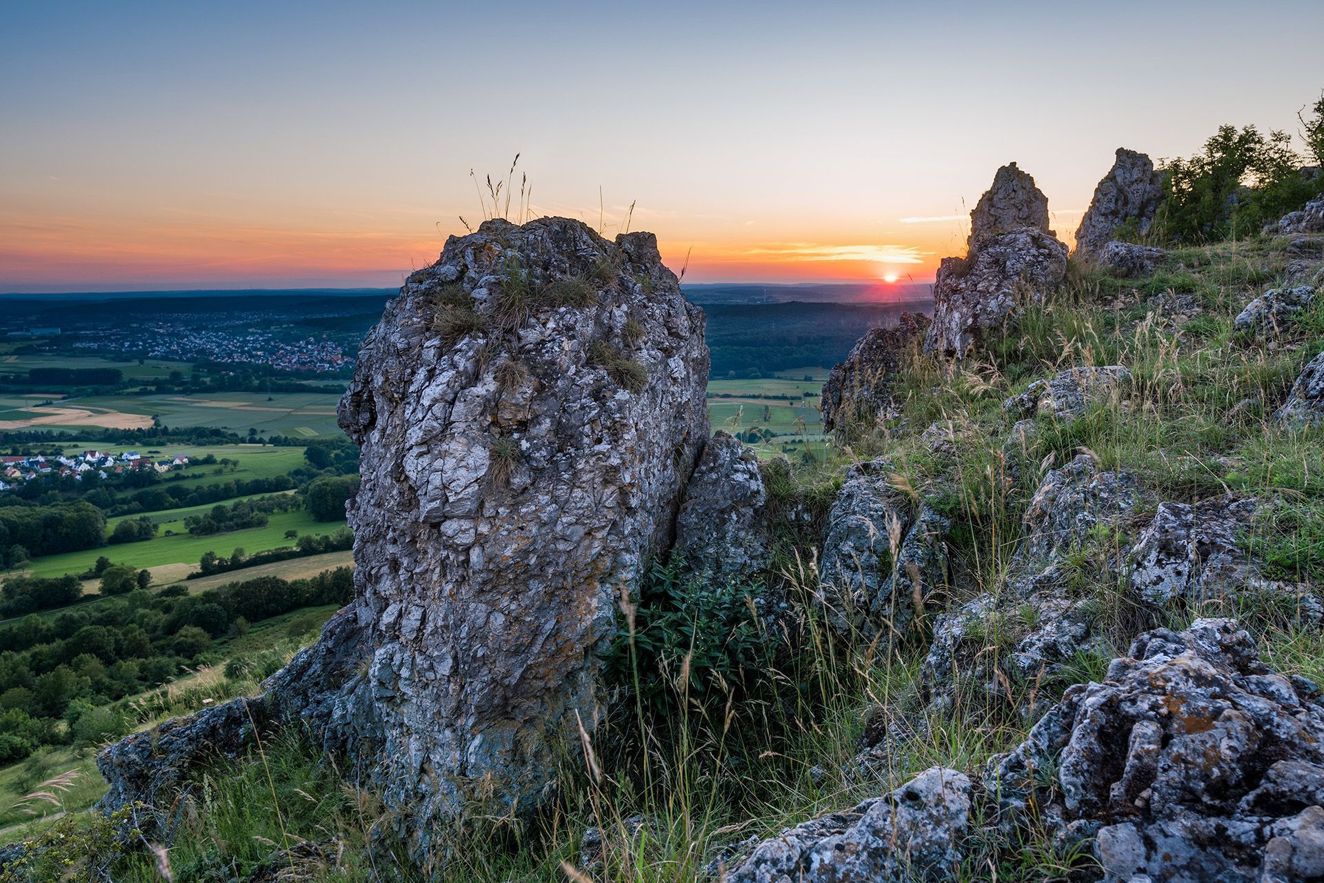 Die Frankenalb besteht im Wesentlichen aus Kalkstein, das in der Jurazeit als Sediment im Jurameer abgelagert wurde. Durch Magnesiumeinlagerung entstand in manchen Bereichen aus dem Kalkgestein das härtere Dolomit. In Laufe der Zeit wurden die weicheren Schichten ausgewaschen. Es blieben beeindruckende Felsformationen wie beispielsweise am Walberla, am Staffelberg und den Talhängen von Streitberg und Muggendorf zurück. Die Grenzen der „Fränkischen Schweiz", wie diese Landschaft wegen ihrer markanten Felsformationen genannt wird, bilden im Norden das obere Maintal sowie die Städte Bayreuth, Erlangen, Forchheim und Bamberg. Westlich von Bamberg erstrecken sich die Ausläufer des Steigerwaldes mit den Keuperböden.